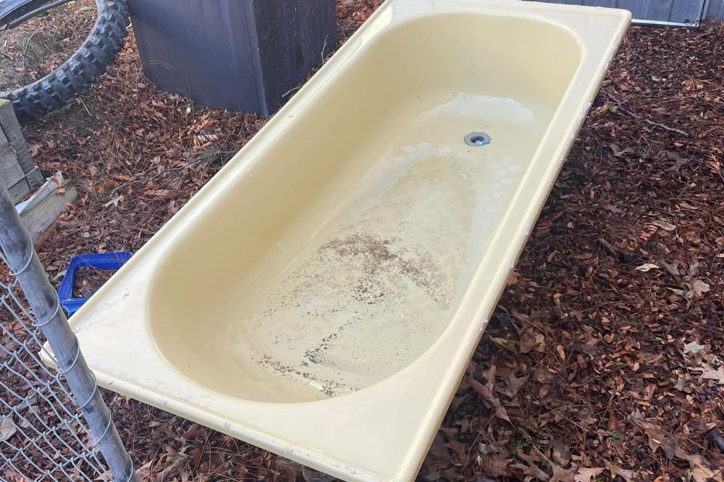 We were lucky enough to find this 1980s steel bath at our local salvage yard and bought it cheap for just $50. After some debate we decided it is a calming shade of cheesy lemon which blends in well and pulls together the earthy brown and leafy green tones of the surrounding environment. The bath cleaned up well and fortunately there were only a couple of blemishes in the enamel. We chose to sit it behind the Shut on the edge of the clearing. An out of the way spot that looked towards the bush, the lush foliage of ferns in the foreground and towering Rimu trees overhead.