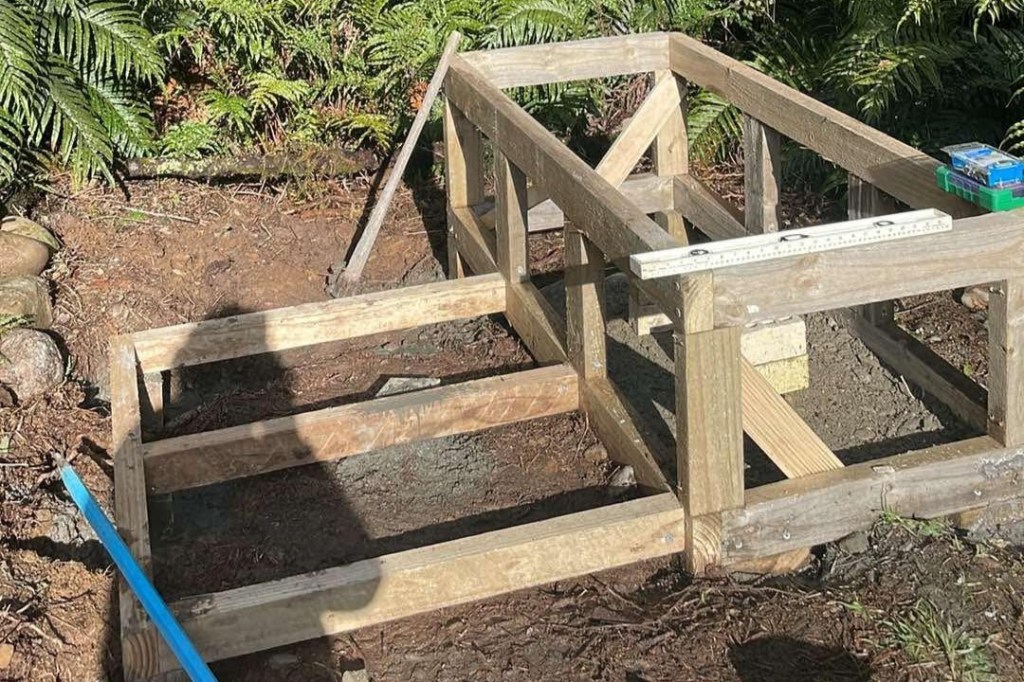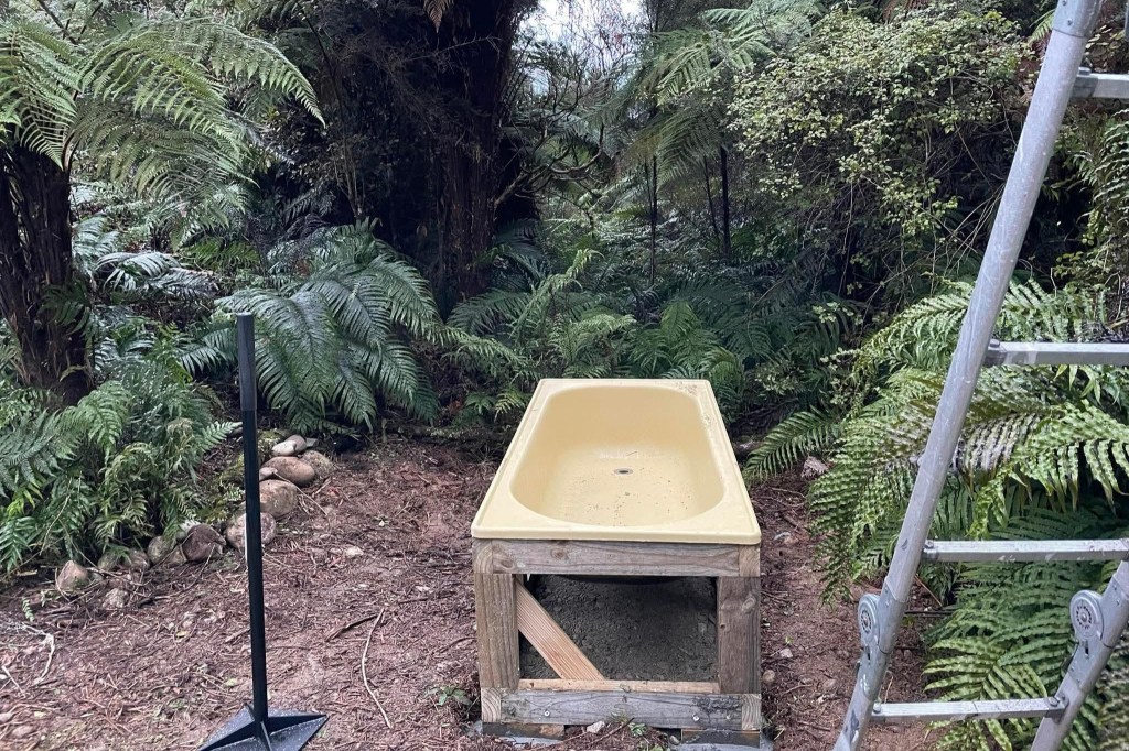 Finally, we have a bath. It is absolute bliss sliding into the warm water at the end of the day. Relaxing back and gazing up at the blue sky framed by Rimu trees towering overhead. The ferns are close enough to touch and the birds, fantails and tom tits, fly playfully amongst the bush. This is another unique experience this beautiful place has to offer. Next, we will stain the timber deck and cladding around the bath. One day we want to upgrade to something a little fancier but for now this works perfectly.
